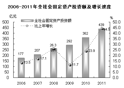 2011年完成固定资产投资额438.74亿元,比上年增长44.5%。其中,城镇投资362.62亿元、农村投资76.12亿元,分别增长40.7%和66.0%。从投资经济类型看,国有经济投资84.43亿元,增长6.9%;民营经济投资275.67亿元,增长87.3%。从三次产业看,第一产业投资3.82亿元,增长119.8%;第二产业投资233.45亿元,增长42.5%。其中工业投资额229.89亿元,增长41.8%;第三产业投资201.47亿元,增长46.0%。其中房地产开发投资额74.06亿元,增长50.2%,交通运输业投资额21.82亿元,下降13.2%;在固定资产投资资金来源总计中,国内贷款28.41亿元,下降51.8%;利用外资6.67亿元,下降8.3%;自筹资金353.15亿元,增长68.3%,其中企事业单位自有资金181.11亿元,增长56.2%。全年单位投资施工项目(不含房地产)1493个,增长47.5%。其中,新开工项目1307个,增长61.8%,重点项目94个,增长14.6%。新增固定资产324.76亿元,增长50.1%。