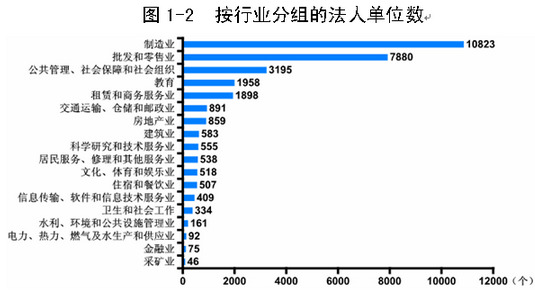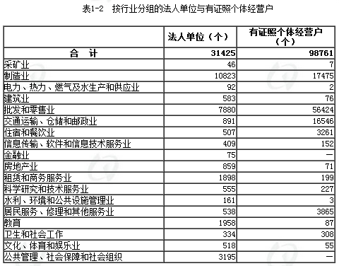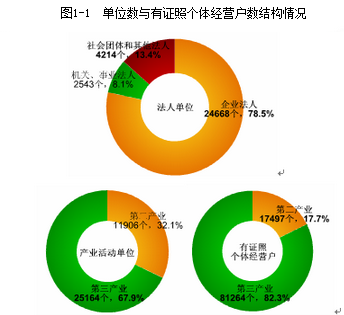 2013年末,在第二产业和第三产业法人单位中,位居前三位的行业是:制造业10823个,占34.4%;批发和零售业7880个,占25.1%;公共管理、社会保障和社会组织3195个,占10.2%。在有证照个体经营户中,位居前三位的行业是:批发和零售业56424个,占57.1%;制造业17475个,占17.7%;交通运输、仓储和邮政业16546个,占16.8%(详见表1-2)。