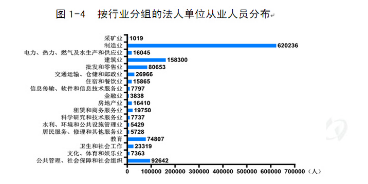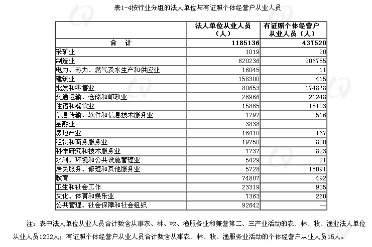 在法人单位从业人员中,位居前三位的行业是:制造业62.02万人,占52.3%;建筑业15.83万人,占13.4%;公共管理、社会保障和社会组织9.26万人,占7.8%。在有证照个体经营户从业人员中,位居前三位的行业是:制造业20.68万人,占49.5%;批发和零售业17.49万人,占41.9%;交通运输、仓储和邮政业2.12万人,占4.9%(详见表1-4)。