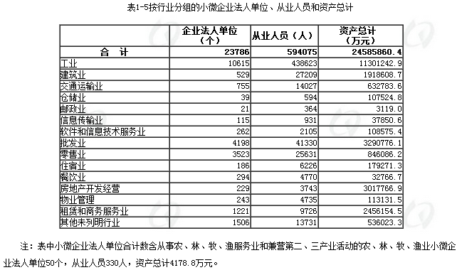 小微企业法人单位资产总计2458.59亿元,占全部企业法人单位资产总计31.2%。其中,位居前三位的行业是:工业1130.12亿元,占全部企业法人单位资产总计14.3%;批发业329.07亿元,占4.2%;房地产开发经营301.78亿元,占3.8%(详见表1-5)