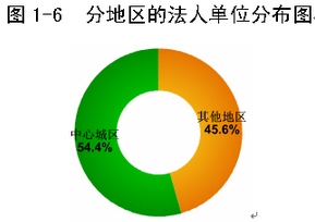 在法人单位中,中心城区占54.4%,比2008年末提高了2.4个百分点;法人单位从业人员中心城区占46.3%,比2008年末下降了3.9个百分点(详见表1-6)。