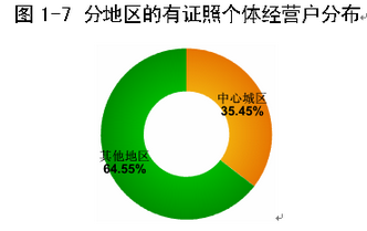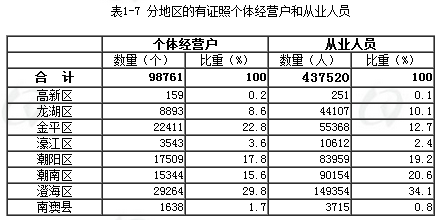 在有证照个体经营户中,中心城区占35.4%,比2008年末下降了1.3个百分点;有证照个体经营户从业人员中,中心城区占占24.8%,比2008年末下降了7.6个百分点(详见表1-7)。