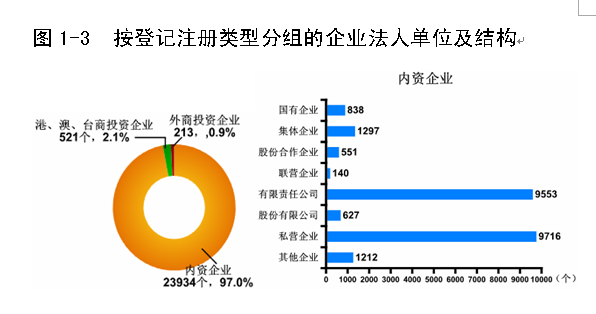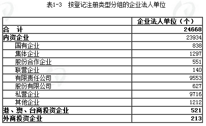 2013年末,全市共有第二产业和第三产业的企业法人单位24668个,比2008年末增加7377个,增长42.7%。其中,内资企业23934个,占97.0%;港、澳、台商投资企业521个,占2.1%;外商投资企业213个,占0.9%。内资企业中,国有企业838个,占全部企业法人单位的3.4%;私营企业9716个,占39.4%(详见表1-3)。