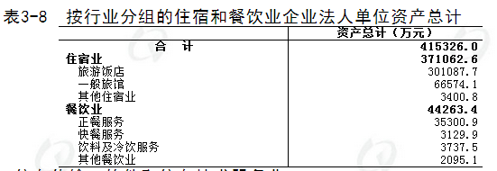 2013年末,住宿和餐饮业企业法人单位资产总计为41.53亿元,比2008年末增长16.1%。其中,住宿业企业法人单位资产总计37.11亿元,餐饮业企业法人单位资产总计4.43亿元,分别比2008年末增长14.8%和27.9%(详见表3-8)。