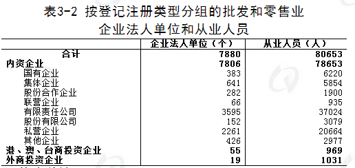 在批发和零售业企业法人单位从业人员中,内资企业占97.5%,港、澳、台商投资企业占1.2%,外商投资企业占1.3%(详见表3-2)。