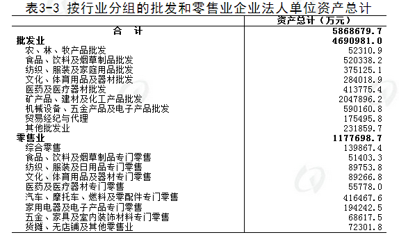 2013年末,批发和零售业企业法人单位资产总计586.87亿元,比2008年末增长136.5%。其中,批发业企业法人单位资产总计469.10亿元,零售业企业法人单位资产总计117.77亿元,分别比2008年末增长140.5%和122.0%(详见表3-3)。