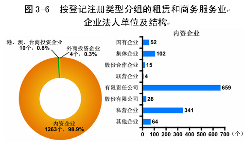 在租赁和商务服务业企业法人单位中,内资企业占98.9%,港、澳、台商投资企业占0.8%,外商投资企业占0.3%。