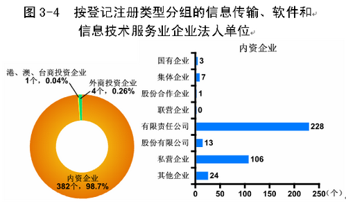 在信息传输、软件和信息技术服务业企业法人单位中,内资企业占98.7%,港、澳、台商投资企业占0.3%,外商投资企业占1.0%。