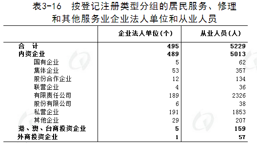 2013年末,全市共有居民服务、修理和其他服务业企业法人单位495个,从业人员5229人,分别比2008年末增长60.7%和76.6%。