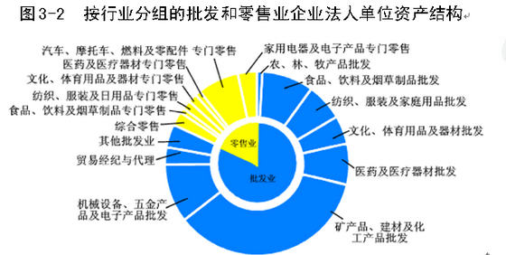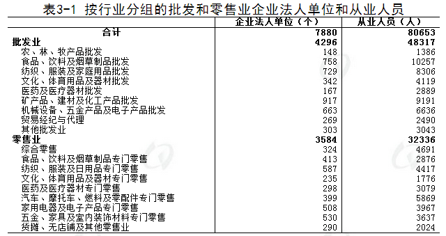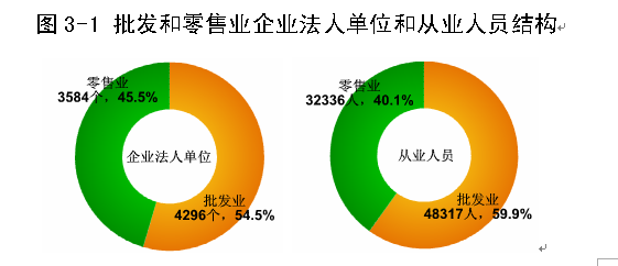 在批发和零售业企业法人单位中,批发业占54.5%,零售业占45.5%。在批发和零售业企业法人单位从业人员中,批发业占59.9%,零售业占40.1%(详见表3-1)。