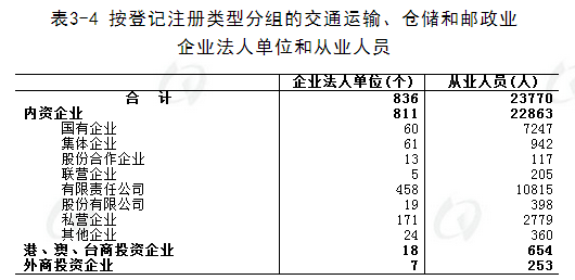 在交通运输、仓储和邮政业企业法人单位从业人员中,内资企业占96.2%,港、澳、台商投资企业占2.8%,外商投资企业占1.0%(详见表3-4)。