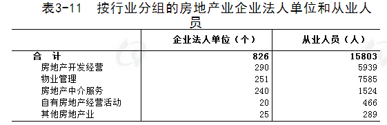 2013年末,全市房地产业企业法人单位的从业人员为15803人。其中,房地产开发经营企业5939人,物业管理企业7585人,房地产中介服务企业1524人,分别比2008年末增长16.7%、12.5%和165.5%(详见表3-11)。