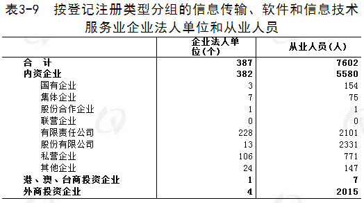 在信息传输、软件和信息技术服务业企业法人单位从业人员中,内资企业占73.4%,港、澳、台商投资企业占0.1%,外商投资企业占26.5%(详见表3-9)。