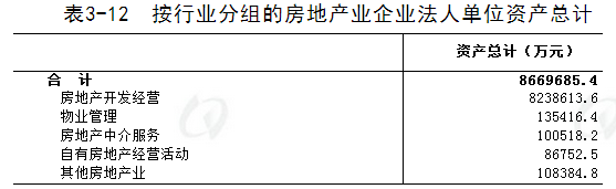 2013年末,全市房地产业企业法人单位的资产总计为866.97亿元,比2008年末增长165.1%。其中,房地产开发企业823.86亿元,物业管理企业13.54亿元,房地产中介服务企业10.05亿元。(详见表3-12)。