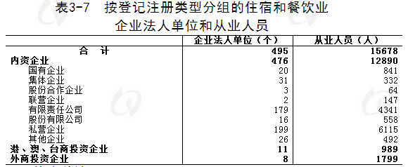 在住宿和餐饮业企业法人单位从业人员中,内资企业占82.2%,港、澳、台商投资企业占6.3%,外商投资企业占11.5%(详见表3-7)。