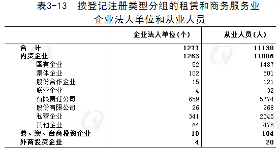 2013年末,全市共有租赁和商务服务业企业法人单位1277个,从业人员11130人,分别比2008年末增长99.8%和36.2%。