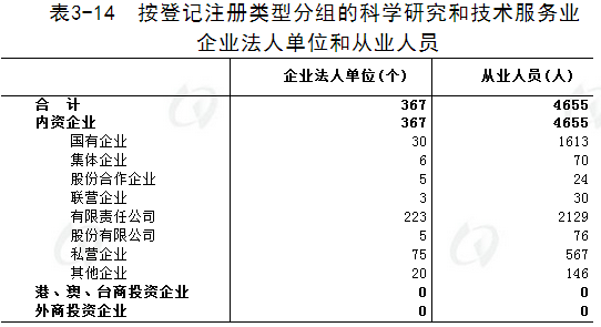 在科学研究和技术服务业企业法人单位从业人员中,内资企业占100%(详见表3-14)。