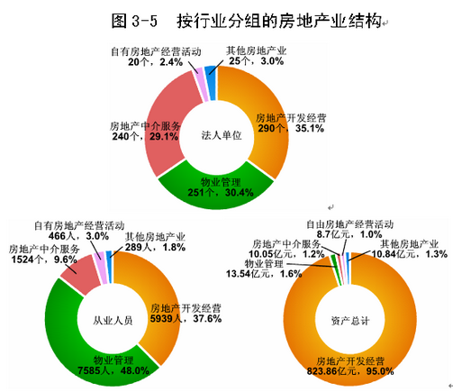 2013年末,全市共有房地产业企业法人单位826个,比2008年末增长57.4%。其中,房地产开发经营企业290个,物业管理企业251个,房地产中介服务企业240个,分别比2008年末增长17.9%、84.6%和130.8%。