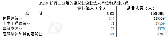 建筑业企业法人单位从业人员中,房屋建筑业占75.5%;土木工程建筑业占17.2%;建筑安装业占3.4%;建筑装饰和其他建筑业占3.9%(详见表2-8)。