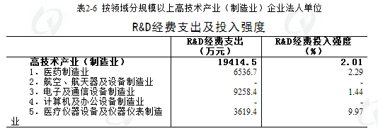 2013年,规模以上高技术产业(制造业)企业法人单位R&D经费支出1.94亿元,比2008年增长29.7%;R&D经费投入强度为2.01%,比2008年提高0.31个百分点,比规模以上制造业平均水平高1.49个百分点(详见表2-6)。