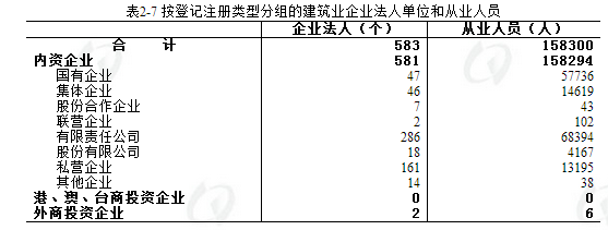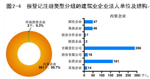 建筑业企业法人单位中,内资企业581个,占99.7%,外商投资企业2个,占0.3%。内资企业中,国有企业公司47个,占全市建筑业企业法人单位的8.1%,集体企业46个,占全市建筑业企业法人单位的7.9%,私营企业161个,占27.6%,有限责任公司286家,占全市建筑业企业法人单位的49.1%,其余类型企业41个,占7.0%。
