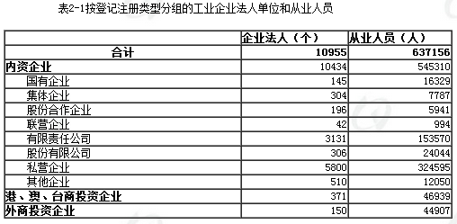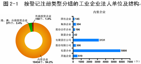在工业企业法人单位中,内资企业10434个,占95.2%;港、澳、台商投资企业371个,占3.4%;外商投资企业150个,占1.4%。内资企业中,国有企业145个,占全部企业的1.3%;集体企业304个,占2.8%;有限责任公司3131个,占28.6%;私营企业5800个,占52.9%。