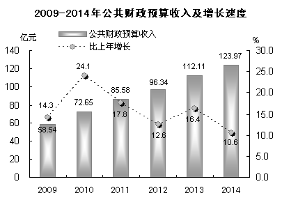 全市完成公共财政预算收入123.97亿元,比上年增长10.6%;公共财政预算支出208.16亿元,增长11.2%。