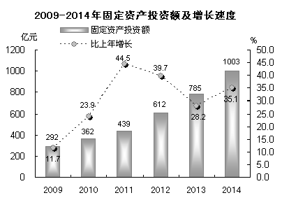 2014年全市完成固定资产投资1002.73亿元,比上年增长35.1%。从投资经济类型看,国有经济投资150.51亿元,增长33.5%;民营经济投资788.20亿元,增长39.5%。从三次产业看,第一产业投资8.83亿元,增长9.8%;第二产业投资506.72亿元,增长33.1%,其中工业投资503.64亿元,增长33.3%;第三产业投资487.18亿元,增长37.9%,其中房地产开发投资202.05亿元,增长37.4%;交通运输业投资45.88亿元,增长61.0%;现代服务业投资389.39亿元,增长48.7%。在固定资产投资资金来源总计中,国内贷款61.75亿元,下降6.6%;利用外资0.12亿元,下降88.3%;自筹资金861.25亿元,增长44.6%,其中企事业单位自有资金608.33亿元,增长41.2%。全年单位投资施工项目(不含房地产)2335个,增长16.8%,其中新开工项目2041个,增长19.4%。全年新增固定资产828.00亿元,增长34.4%。