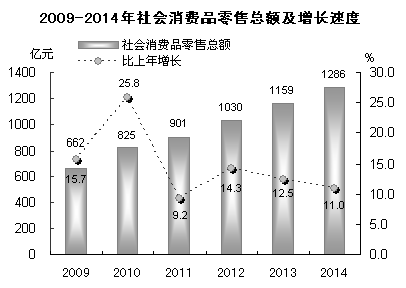 全年社会消费品零售总额1286.04亿元,比上年增长11.0%。其中,城镇消费品零售额931.48亿元,增长12.1%;农村消费品零售额354.56亿元,增长8.0%。分行业看,批发和零售业零售额1208.40亿元,增长11.3%;住宿和餐饮业零售额77.64亿元,增长6.4%。