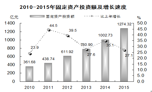全年完成固定资产投资1274.32亿元,比上年增长27.1%。从投资经济类型看,国有投资154.10亿元,增长2.4%;民间投资1051.40亿元,增长33.4%。从三次产业投资看,第一产业投资8.42亿元,增长36.3%;第二产业投资661.24亿元,增长30.7%,其中工业投资659.96亿元,增长31.1%;第三产业投资604.66亿元,增长23.2%,其中交通运输业投资38.45亿元、下降15.7%,现代服务业投资501.65亿元、增长28.5%。在固定资产投资资金来源总计中,国内贷款41.48亿元,下降32.8%;利用外资0.56亿元,增长352.4%;自筹资金1168.89亿元,增长35.7%,其中企事业单位自有资金885.69亿元,增长45.6%。全年施工项目(不含房地产)2780个,增长22.4%,其中新开工项目2477个,增长21.4%。新增固定资产1151.20亿元,增长52.1%。
