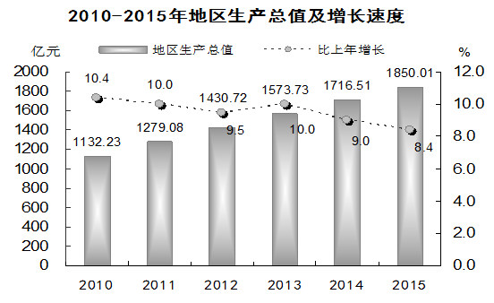 初步核算,2015年全市实现地区生产总值1850.01亿元,比上年增长8.4%。其中,第一产业增加值97.31亿元,增长3.3%;第二产业增加值956.69亿元,增长7.4%;第三产业增加值796.01亿元,增长10.4%。三次产业结构由上年的5.4∶52.6∶42.0调整为5.3∶51.7∶43.0。在第三产业增加值中,批发和零售业增长9.3%,住宿和餐饮业增长3.5%,金融业增长13.8%,房地产业增长11.7%。现代服务业加快发展,实现增加值317.88亿元,增长12.6%。民营经济增加值1304.44亿元,增长9.1%。全市人均GDP33406元,增长7.7%。