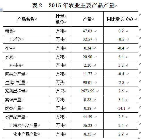 全年农林牧渔业增加值98.99亿元,比上年增长3.3%;农林牧渔业总产值179.01亿元,增长3.4%。其中,农业产值90.69亿元,增长3.5%;林业产值0.67亿元,增长1.7%;牧业产值30.28亿元,增长4.6%;渔业产值53.28亿元,增长2.9%;农林牧渔服务业产值4.09亿元,增长0.8%。