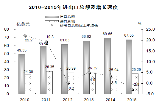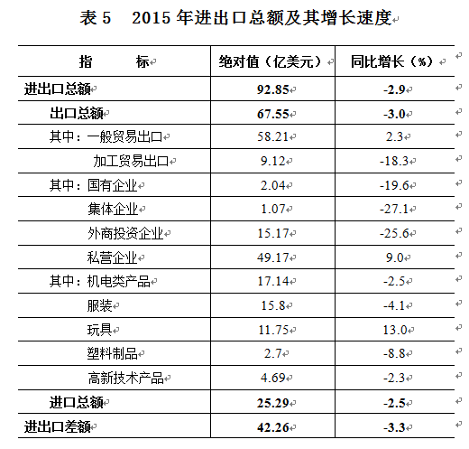 2015年全市进出口总额92.85亿美元,比上年下降2.9%。其中,进口总额25.29亿美元,下降2.5%;出口总额67.55亿美元,下降3.0%。进出口差额(出口减进口)42.26亿美元,比上年减少1.46亿美元。