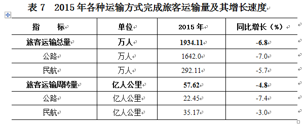 全年旅客运输总量1934.11万人,下降6.8%。旅客运输周转量57.62亿人公里,下降4.8%。