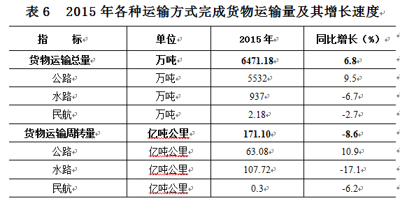 全年交通运输、仓储和邮政业实现增加值41.95亿元,比上年增长4.2%。货物运输总量6471.18万吨,增长6.8%。货物运输周转量171.10亿吨公里,下降8.6%。