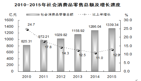 全年社会消费品零售总额1339.34亿元,比上年增长12.9%。其中,城镇消费品零售额974.15亿元,增长14.0%;农村消费品零售额365.19亿元,增长10.2%。分行业看,批发和零售业零售额1259.66亿元,增长13.2%;住宿和餐饮业零售额79.68亿元,增长8.5%。在限额以上批发和零售业商品销售中,通过互联网实现的商品销售额22.12亿元,增长379.1%。