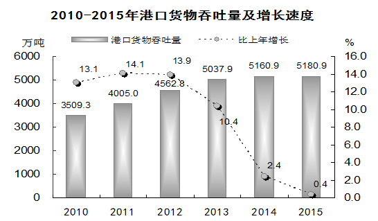 全年港口完成货物吞吐量5180.9万吨,比上年增长0.4%。其中,港口集装箱吞吐量117.9万标准箱,下降9.6%。