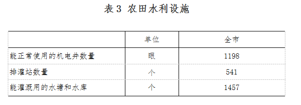 2016年末,我市调查村中能够正常使用的机电井数量1198眼,排灌站数量541个,能够使用的灌溉用水塘和水库数量1457个。