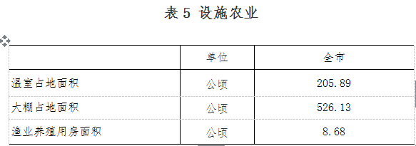 2016年末,我市温室占地面积205.89公顷,大棚占地面积526.13公顷,渔业养殖用房面积8.68公顷。