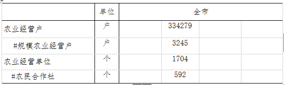 2016年,我市农业经营户33.43万户,其中规模农业经营户0.32万户。我市农业经营单位1704个,其中农业普查登记的以农业生产经营或服务为主的农民合作社592个