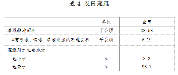 2016年末,我市灌溉耕地面积38.53千公顷,其中有喷灌、滴灌、渗灌设施的耕地面积5.19千公顷;灌溉用水主要水源中,使用地下水的户和农业生产单位占3.3%,使用地表水的户和农业生产单位占96.7%。