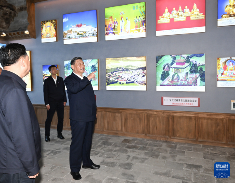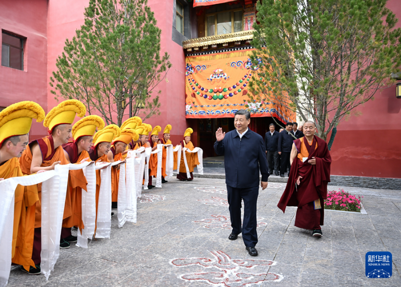 随后,习近平来到位于西宁市城中区的宏觉寺。在寺前院落,宏觉寺民主管理委员会负责人向总书记敬献哈达,僧人提香炉、持宝伞迎接总书记。习近平参观青海省民族团结进步教育基地展陈等,了解寺庙历史沿革、老一辈革命家关心推动民族工作和宗教工作的情况。他走进大殿,听取寺庙加强日常管理、促进民族团结进步等情况介绍。习近平指出,宏觉寺这座千年古刹,在增进历代中央政府与藏传佛教联系方面发挥了重要的桥梁纽带作用。要保护好这份珍贵的历史文化遗产,为铸牢中华民族共同体意识、促进民族团结进步作出新贡献。要向老一辈革命家学习,把新时代党的统战工作、民族工作、宗教工作做得更好。习近平强调,以中国式现代化全面推进强国建设、民族复兴伟业,需要全国各族人民包括广大信教群众团结奋斗。希望青海藏传佛教界弘扬爱国爱教优良传统,促进宗教和顺、社会和谐、民族和睦,在中国式现代化进程中发挥积极作用。