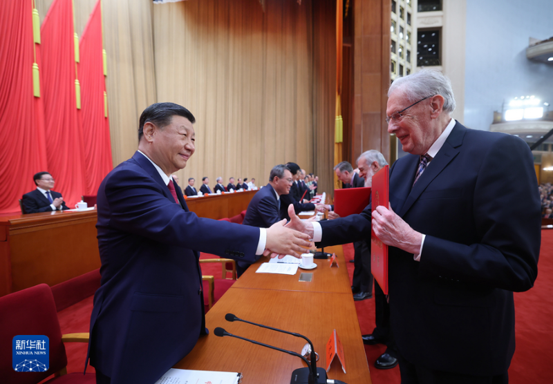 (6月24日,全国科技大会、国家科学技术奖励大会和中国科学院第二十一次院士大会、中国工程院第十七次院士大会在北京人民大会堂隆重召开。中共中央总书记、国家主席、中央军委主席习近平向获得2023年度国家最高科学技术奖的清华大学薛其坤院士颁奖。新华社记者 鞠鹏 摄)