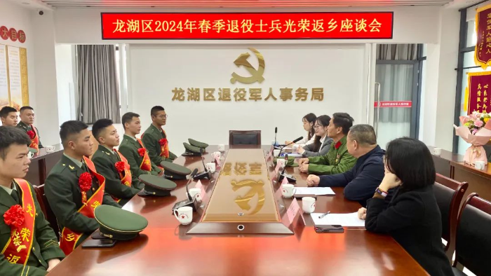 欢迎仪式上,工作人员为光荣返乡的17名退役士兵代表佩戴红花和绶带,送上鲜花,并集中合影留念。在返乡座谈会上,邀请一等功臣周跃明分享他在军队锻炼成长成才和退役后的工作经历,以榜样的力量激励退役士兵。期间,退役士兵一起观看《“老兵永远跟党走—老兵宣讲”实践活动》专题片,相关业务股室负责人向退役士兵们讲解抚恤优待、教育培训、就业创业等各项退役军人政策。局领导向光荣返乡的退役士兵表示热烈欢迎,勉励退役士兵在今后学习、创业、工作过程中永葆军人本色,积极投入到“百千万工程”中,建设绿美龙湖。