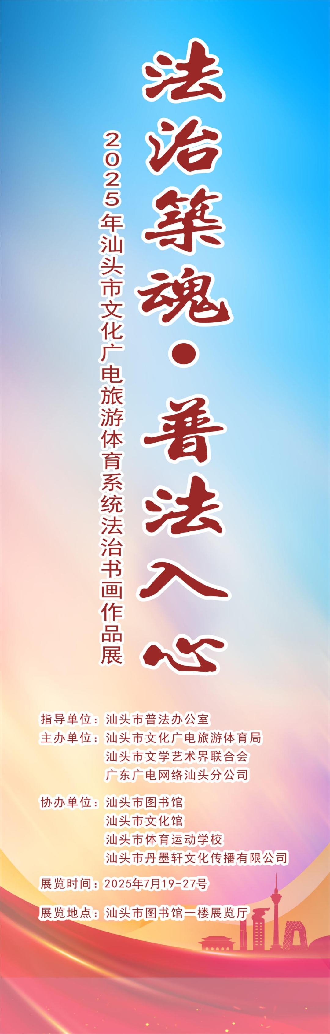 前言 法者,治之端也;艺者,心之华也。此次由汕头市普法办公室指导,汕头市文化广电旅游体育局发起,联合汕头市文学艺术界联合会、广东广电网络汕头分公司举办的法治书画展览,旨在以笔墨为媒,书写法治华章,在传统与现代的交融中,充分展现法治的闪光内涵、深厚底蕴与时代光芒。 欣观社会各界踊跃报名、热情参与,作品丰厚,参展作品或挥毫写就宪法精神,或工笔勾勒正义天平,或泼彩渲染和谐图景,既彰显艺术之美,更传递法治之魂。透过这一幅幅作品,我们不仅坚定地传递政府推进法治建设的不懈努力,也积极推动所有的参与者尽情表达对公平正义的礼赞,表达法治建设的温度与力量,尽情抒发广大人民群众对法治社会的向往。 法治文化浸润人心,书画艺术传情达意。此次展览不仅是一次绚丽多彩的艺术成果的展示,更是一场熠熠夺目的法治文化的传播之旅。愿此展成为一座桥梁,让法治信仰通过艺术感染力深入人心,让尊法学法守法用法成为全社会的共同追求。 谨以此展致敬所有法治建设的参与者、倡导者与践行者。