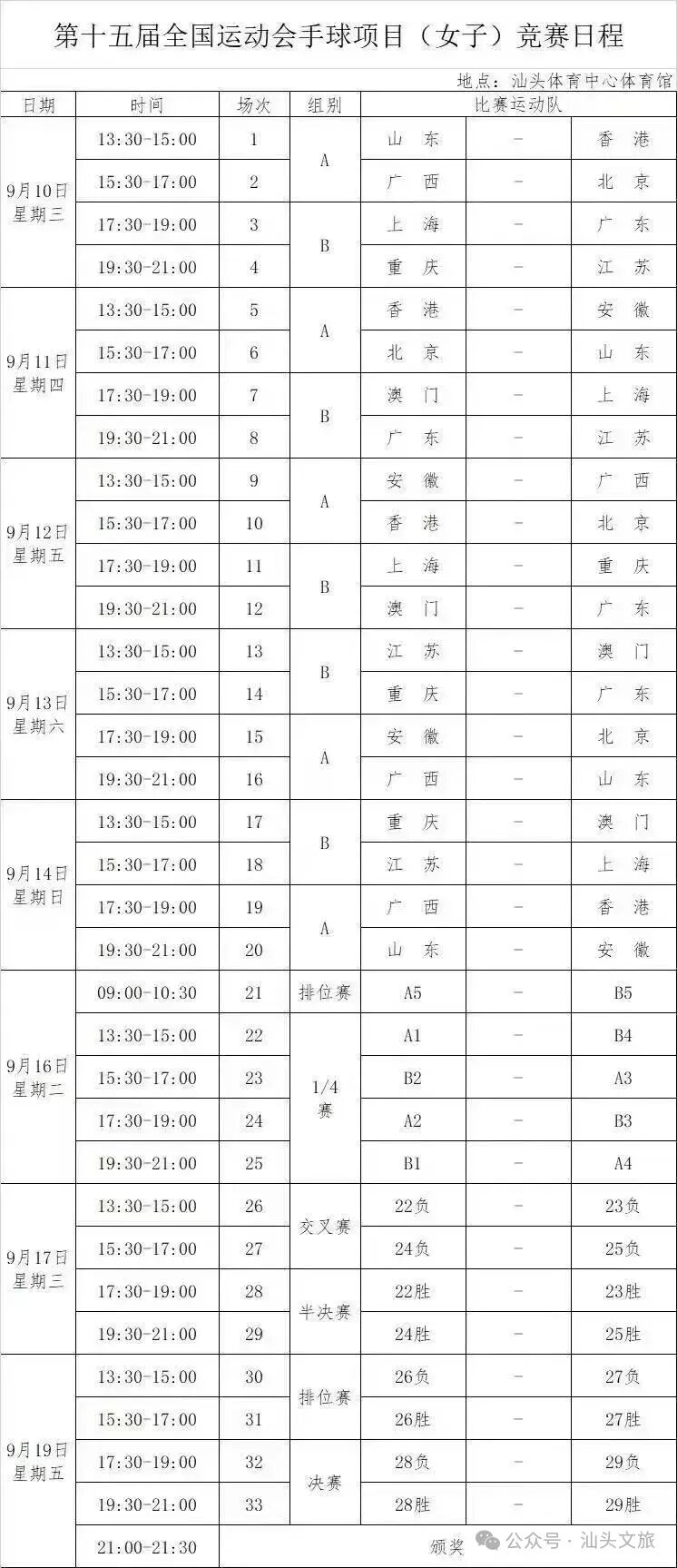 9月10日,是十五运会手球女子组比赛首个比赛日。整个赛事将持续到9月19日,来自山东、安徽、广西、香港、北京、江苏、上海、重庆、澳门和广东等地的10支球队将展开33场精彩较量。