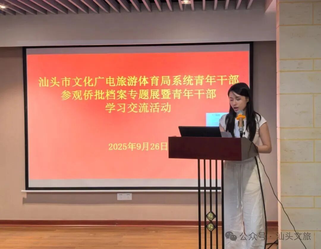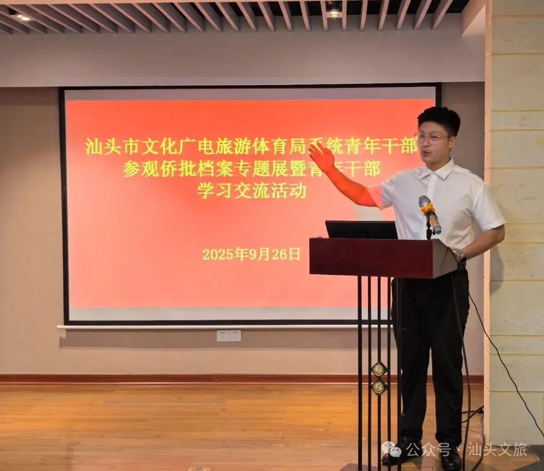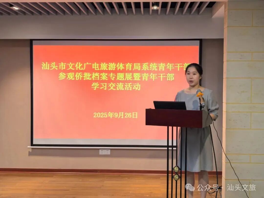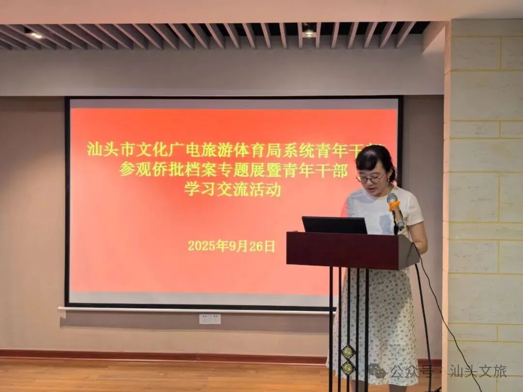 为缅怀革命先烈,传承爱国精神,深刻感悟侨胞在抗战时期的历史贡献,9月26日上午,市文化广电旅游体育局组织青年干部到市博物馆参观“烽火侨批家国情”纪念中国人民抗日战争暨世界反法西斯战争胜利80周年侨批档案专题展,并举办青年干部学习交流活动。局党组成员、副局长潘丽辉同志参加座谈交流,局下属各单位主要负责人及分管人事工作的领导、局机关及下属各单位近五年新入职的青年干部参加活动。