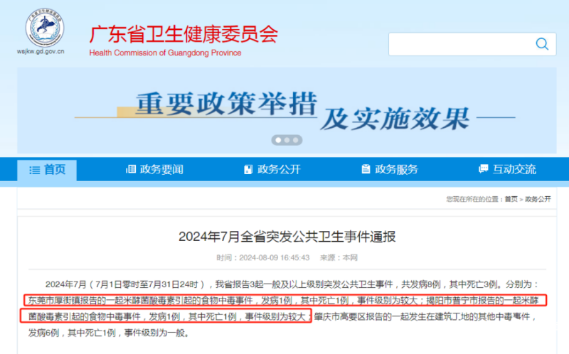 近日,广东省卫生健康委官网发布一则通报引发关注:7月广东省共报告3起一般及以上级别突发公共卫生事件,其中有2起为米酵菌酸毒素引起的食物中毒事件,共致2人死亡。