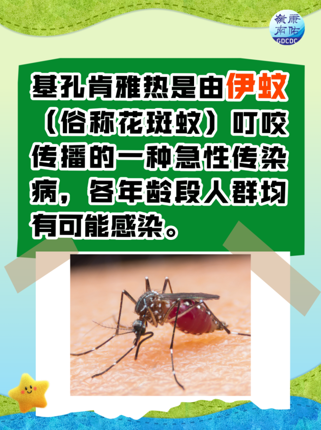 基孔肯雅热是由基孔肯雅病毒引起的、通过媒介伊蚊(俗称“花斑蚊”)叮咬传播的一种急性传染病。