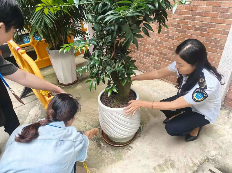 执法人员检查住宿场所绿植盆栽是否有蚊虫孳生。